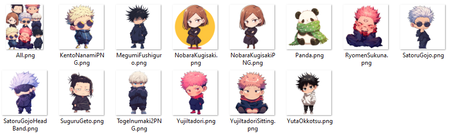 Experience the thrilling world of Jujutsu Kaisen with our exclusive digital collection featuring 14 iconic character designs. Each image is presented in high-quality PNG format with a transparent background, making them perfect for all your creative projects. From Satoru Gojo’s enigmatic charm to Ryomen Sukuna’s sinister aura, these 1024×1024 pixel images capture the essence of each character.